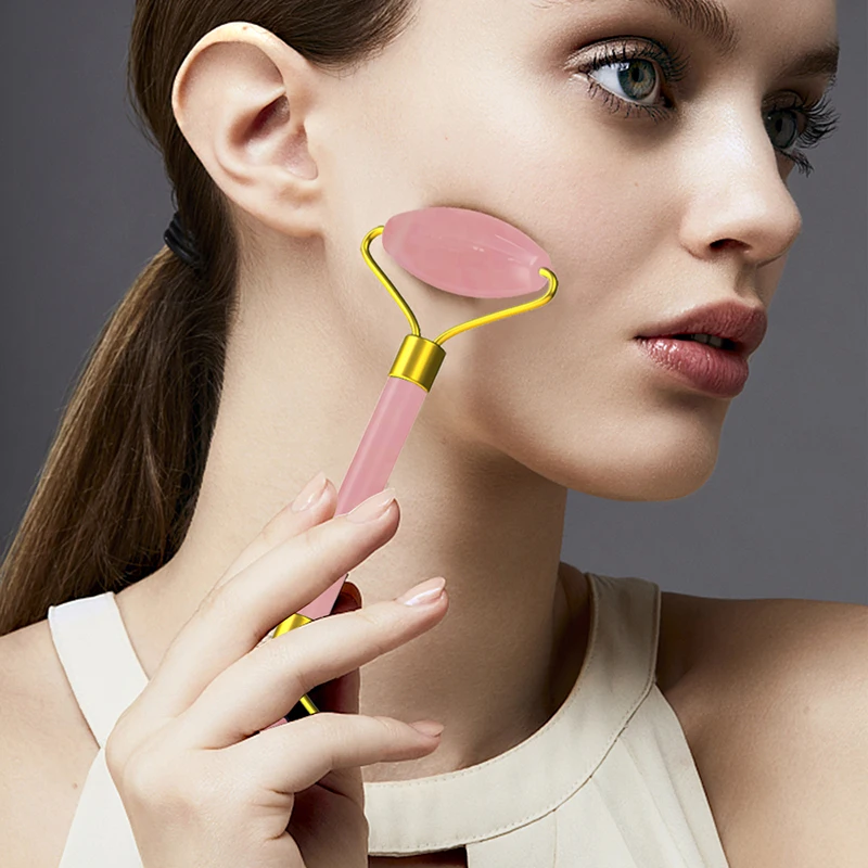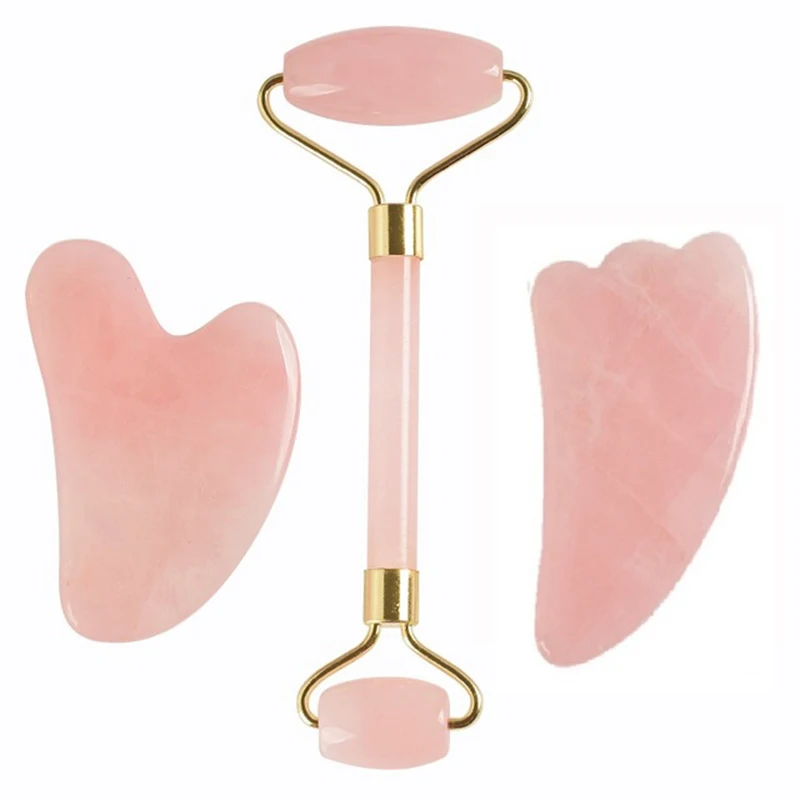 Discount 3PCS/Set Natural Rose Quartz Roller Slimming Face Massager Lifting Facial Massage Jade Roller Gua Sha Board Stone Skin Massage