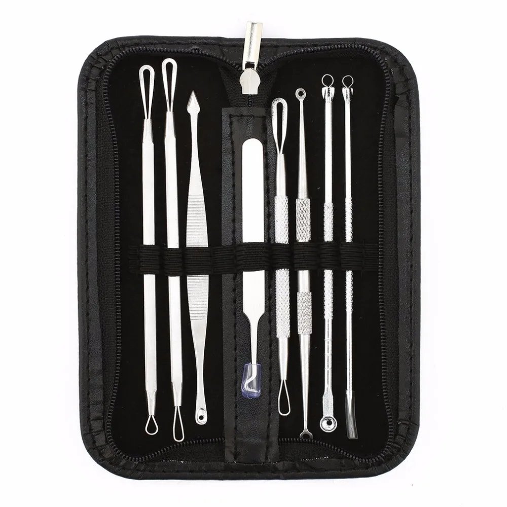 Best Seller 8 Pcs Blackhead Remover Tool Kit Pimple Acne Clip Needle Face Care Comedone Blemish Blackhead Extractor Tool with Leather Case